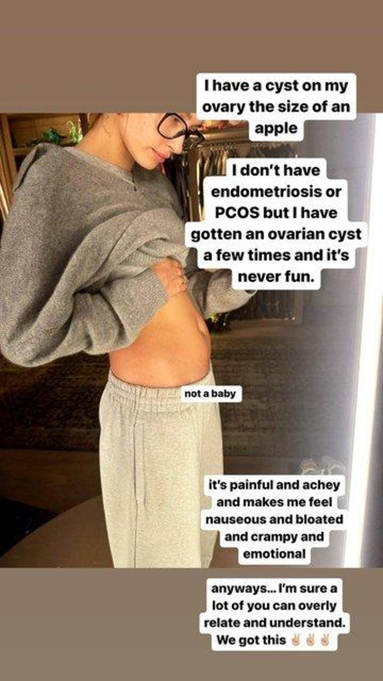 Bu nedenle şişkin olduğunu belirten Hailey Baldwin, ayrıca yumurtalıklarındaki kistin kramplara neden olduğunu ve duygusal hissettiğini söyledi. Model, Endometriozis (rahim içi zarının rahim dışında oluşması durumu) veya PKOS (Polikistik over sendromu) olmadığını da sözlerine ekledi.