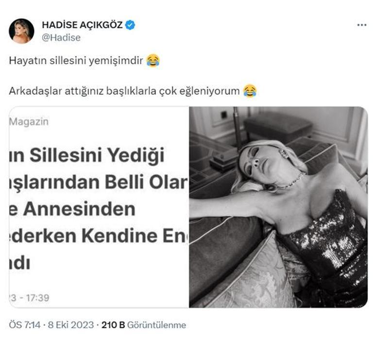 Paylaşımına, "Hayatın sillesini yemişimdir... Arkadaşlar attığınız başlıklarla çok eğleniyorum" mesajını yazan Hadise, kısa sürede sosyal medyada gündem oldu.