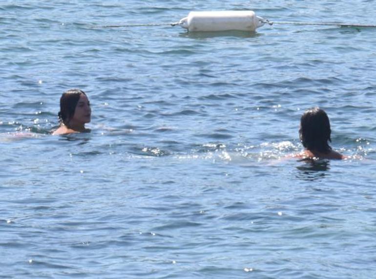 Bodrum'un serin sularının keyfini çıkaran sevgililer, birlikte denize girerek bir süre yüzdü.