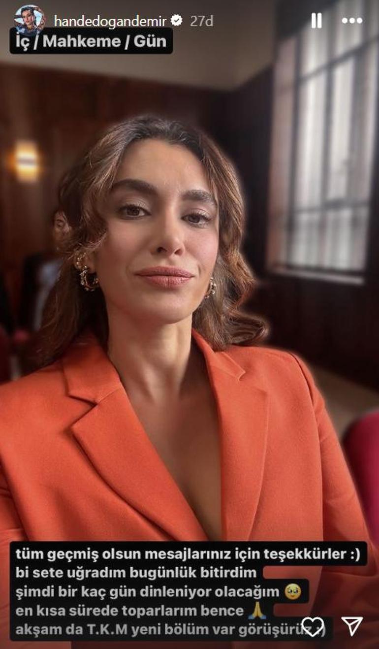 MESUT YILMAZ -Instagram hesabından paylaşım yapan Doğandemir, "Tüm geçmiş olsun mesajlarınız için teşekkürler. Bir sete uğradım bugünlük bitirdim. Şimdi birkaç gün dinleniyor olacağım. En kısa sürede toplarım bence. Akşam da T.K.M'nin yeni bölümü var. Görüşürüz" dedi.