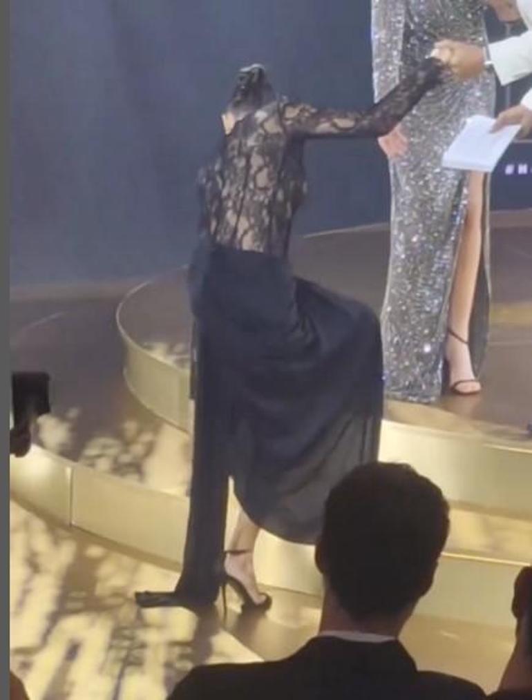 Erçel ödülünü almak için sahneye çıkarken zor anlar yaşadı. Ünlü güzelin topuklu ayakkabısı elbisesine takıldı ve sahneye çıkmasını güçleştirdi. O anlar kameralara yansıdı.