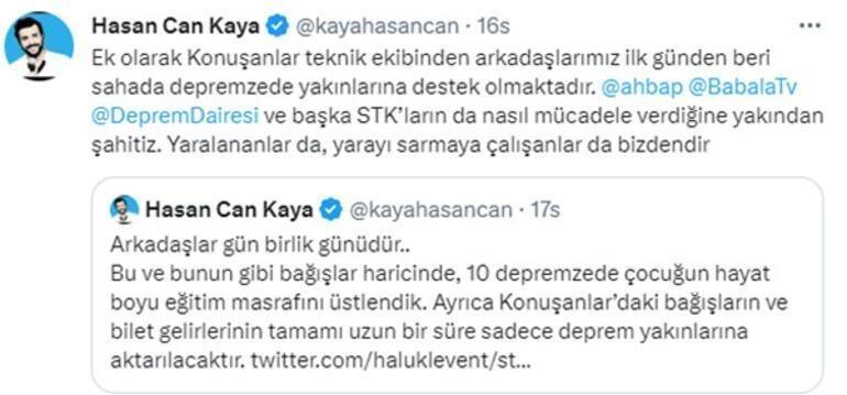 Sosyal medyada bir paylaşım daha yapan Hasan Can Kaya, "Ek olarak Konuşanlar teknik ekibinden arkadaşlarımız ilk günden beri sahada depremzede yakınlarına destek olmaktadır. Yaralananlar da, yarayı sarmaya çalışanlar da bizdendir" ifadelerini kullanmıştı.
