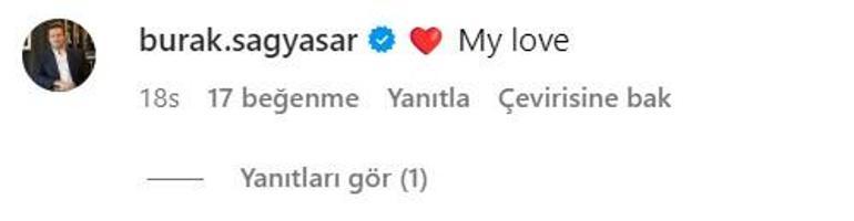 Başına beyaz ve siyah renkli bir bandana bağlayan Hatice Şendil'e eşi Burak Sağyaşar da (My Love) "Aşkım" yorumunu yaptı.