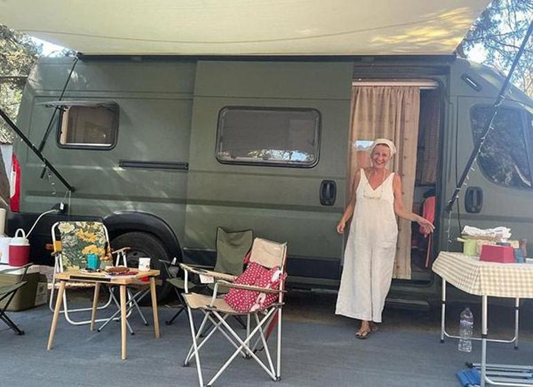 Doğa ile iç içe bir tatil yapmak isteyen Hülya Gülşen, karavanını Balıkesir'in Burhaniye ilçesinde sahilde bulunan bir kamp alanına çekti.