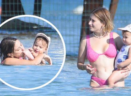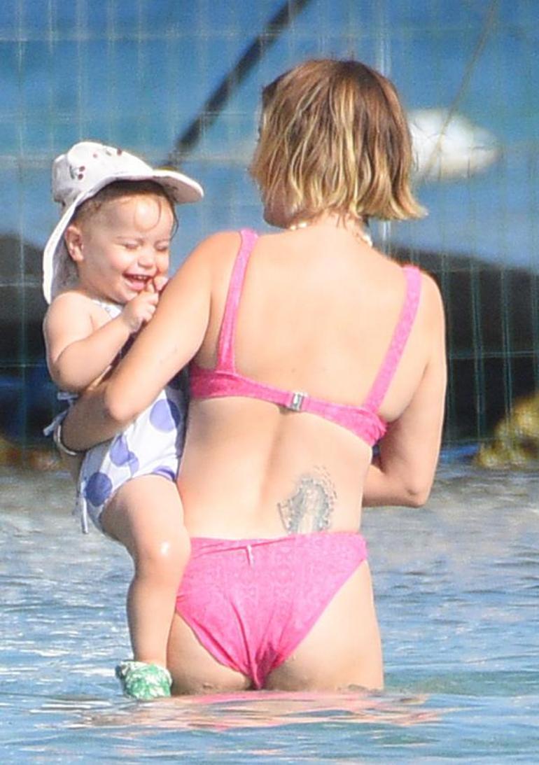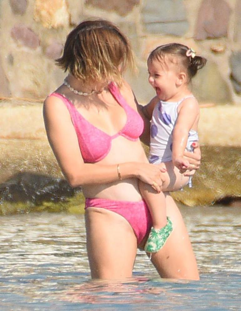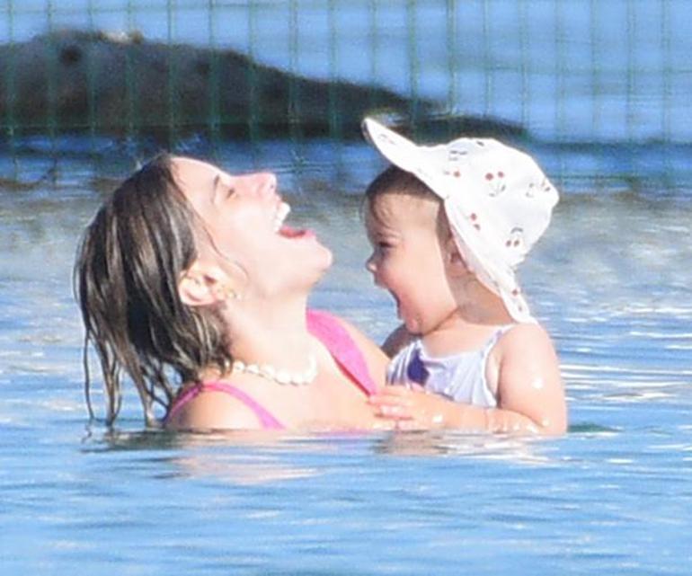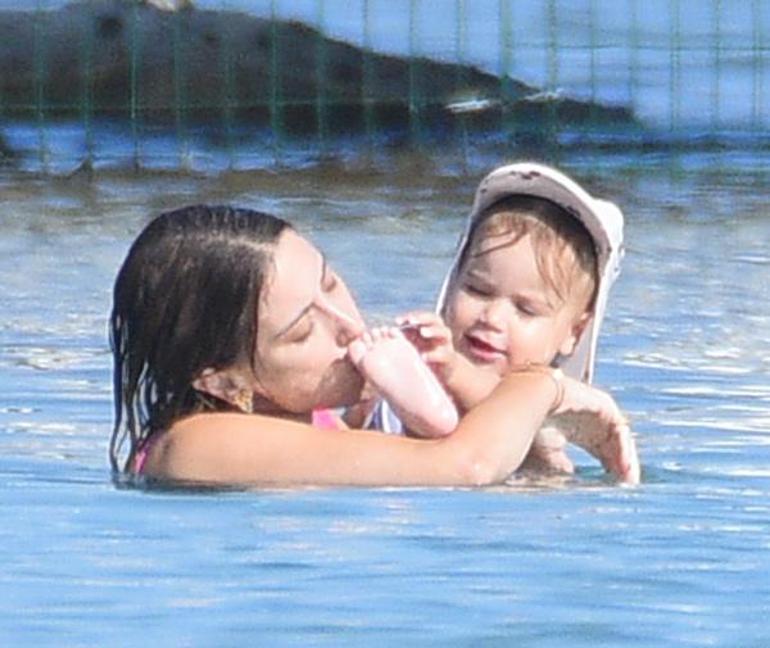 Çocuklarla Çeşme'de tatil! Hazal Kaya kızını denize alıştırdı