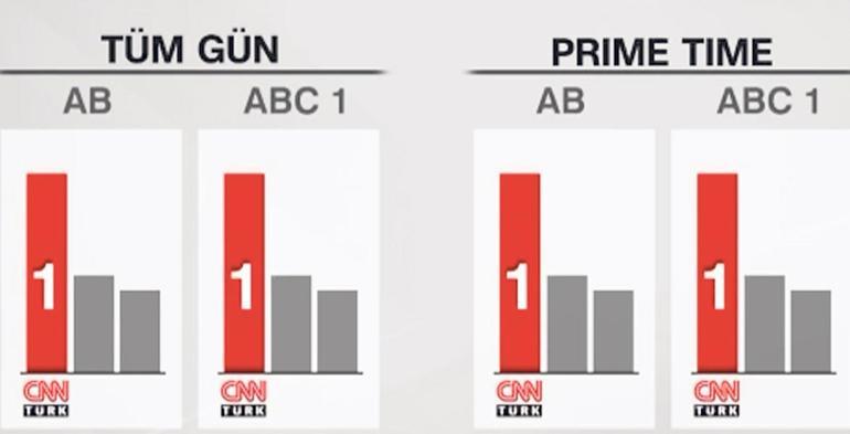 Rakiplerine fark atan CNN TÜRK’ü, izleyicileri bir kez daha birinciliğe taşıdı. Son dakika gelişmeleri, en doğru analiz ve tespitler, CNN TÜRK ekranında izleyiciyle buluştu. Çok sesli ve objektif yayın anlayışıyla CNN TÜRK, AB ve ABC1 kategorilerinde, ‘Tüm Gün’ ve ‘Prime Time’ kuşağında ‘En Çok İzlenen Haber Kanalı’ oldu.