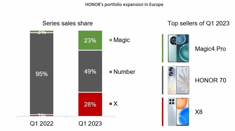Rapora göre Honor, HMD Global dışında 2023’ün ilk çeyreğinde Çin dışındaki pazarlarda büyüme kaydeden tek büyük marka oldu. Şirket, geçen yılın aynı çeyreğine göre dört kat büyüdü.