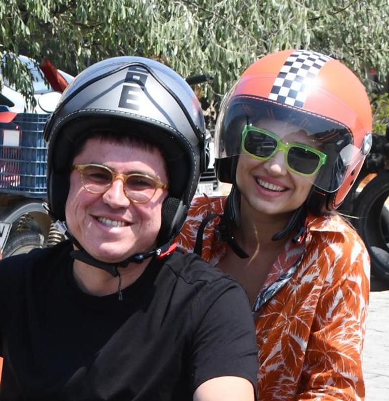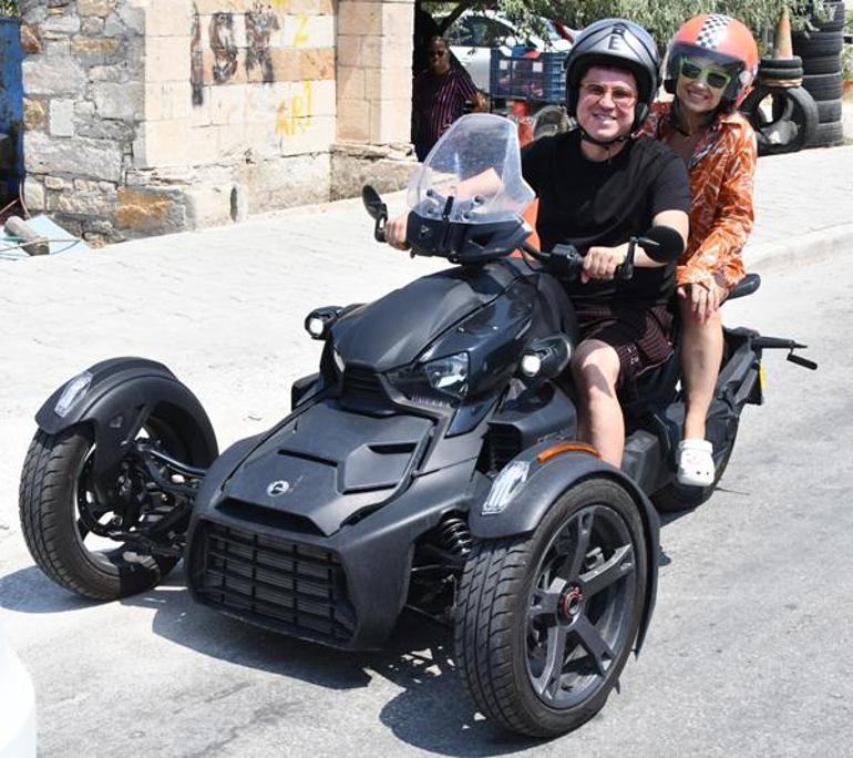 Oyuncu, üç tekerlekli motosikletiyle eşi ile beraber plaja giderken kendisini çeken gazetecileri görünce şaşırdı.