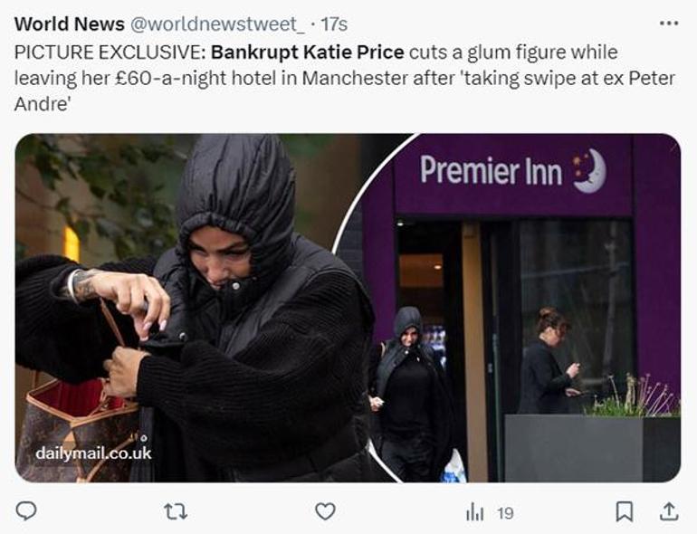 Daily Mail'in haberine göre; çok iyi para kazanırken satın aldığı, ancak sonrasında bakımını karşılayamadığı malikanesinden taşınan Price, yağmur altında Manchester'daki gecelik 60 sterlinlik (yaklaşık 2 bin 105 TL) bir otelden çıkarken objektiflere takıldı.