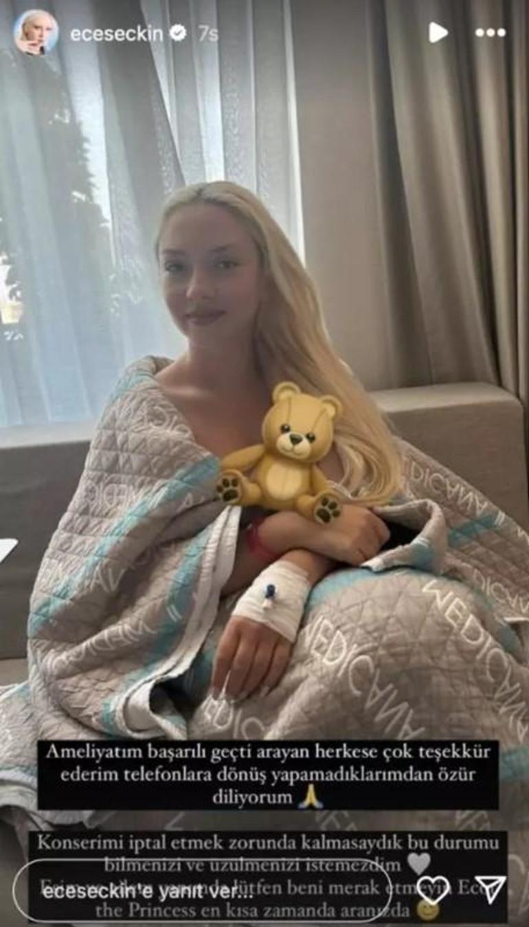 Sağlık durumuna ilişkin bilgi veren şarkıcı, "Ameliyatım başarılı geçti. Arayan herkese çok teşekkür ederim. Telefonlara dönüş yapamadıklarımdan özür diliyorum. Konserimi iptal etmek zorunda kalmasaydık, bu durumu bilmenizi ve üzülmenizi istemezdim. Eşim ve ailem yanımda. Lütfen beni merak etmeyin. Ece the Princess en kısa zamanda aranızda" ifadelerini kullanmıştı.