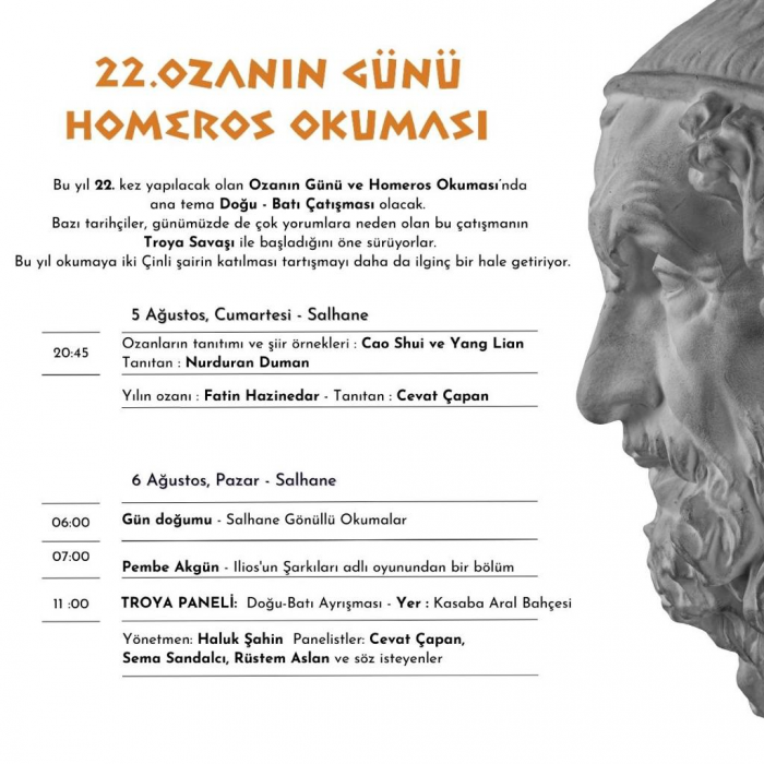 BU YIL 22. KEZ YAPILACAK OLAN “OZANIN GÜNÜ VE HOMEROS OKUMASI” ETKİNLİĞİNDE TANINMIŞ ÇİNLİ ŞAİRLER CAO SHUİ İLE YANG LİAN KENDİ ŞİİRLERİNİ VE HOMEROS’UN DİZELERİNİ OKUYACAKLAR. ETKİNLİĞİN ANA TEMASI DOĞU-BATI AYRIŞIMI.