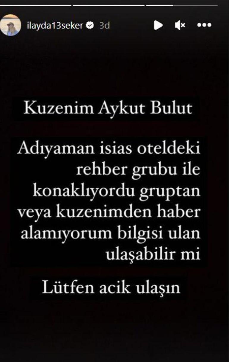 Şeker paylaşımında "Kuzenim Aykut Bulut Adıyaman Isias oteldeki rehber grubu ile konaklıyordu gruptan veya kuzenimden haber alamıyorum" dedi.