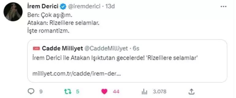 "Ben: Çok aşığım. Atakan: Rizelilere selamlar. İşte romantizm" mesajını yazan İrem Derici'nin, sürpriz aşkını sosyal medyadan eğlenceli bir mesajla duyurması çok konuşulmuştu.