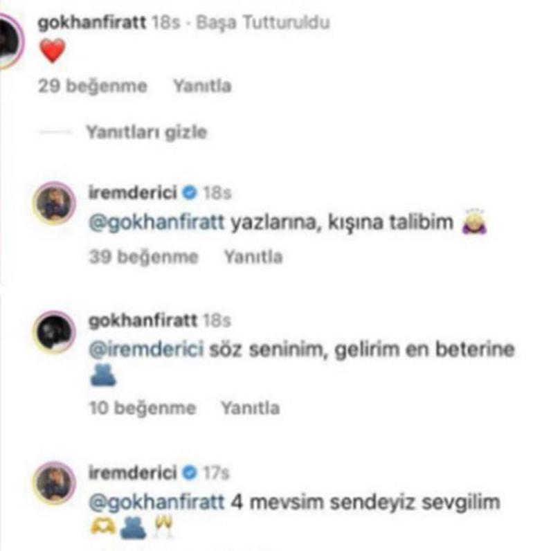 İrem Derici, geçtiğimiz günlerde yaptığı bir yoruma sevgilisini etiketleyerek "Yazlarına, kışına talibim" demişti. Fırat, "Söz seninim, gelirim en beterine" karşılığını vermişti. Ünlü şarkıcı da "dört mevsim sendeyiz sevgilim" mesajı ile aşkını ilan etmişti.