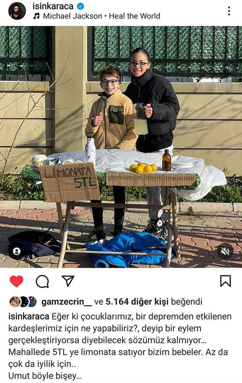 Işın Karaca, Instagram hesabından yaptığı paylaşıma, "Eğer ki çocuklarımız 'Depremden etkilenen kardeşlerimiz için ne yapabiliriz?' deyip, bir eylem gerçekleştiriyorsa diyebilecek sözümüz kalmıyor. Mahallede 5 TL'ye limonata satıyor bizim bebeler. Az da çok da iyilik için. Umut böyle bişey" mesajını yazdı.