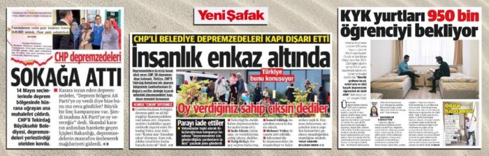 CHP’li Tekirdağ Belediyesi’nin depremzedeleri tesislerinden çıkarmasını üç ay önce manşetlerden “CHP depremzedeleri sokağa attı" diye yazan Yeni Şafak, geçen hafta “KYK yurtları 950 bin öğrenciyi bekliyor" haberinde, depremzedelerin bu yurtlardan çıkarıldığı bilgisine yer vermedi.