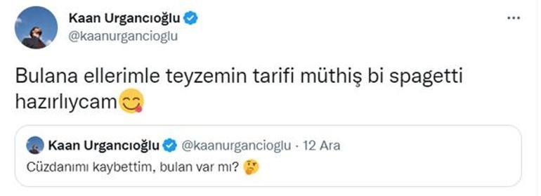 "Cüzdanımı kaybettim, bulan var mı?" diye yazan Urgancıoğlu, ardından kendi Tweet'ini alıntılayarak, "Bulana ellerimle teyzemin tarifi müthiş bir spagetti hazırlayacağım" dedi.