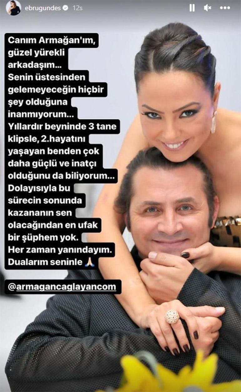 Ebru Gündeş'ten de bir döneme damga vuran 'Popstar' yarışmasında birlikte jüri ükoltuğunda oturduğu Armağan Çağlayan'a destek mesajı geldi. 1999 yılında 'Dön Ne Olur' albümünün tanıtımı sırasında kameraların karşısında beyin kanaması geçiren ve ölümden dönen şarkıcı, Instagram'da ünlü yapımcı ile olan bir fotoğrafını yayınladı.
