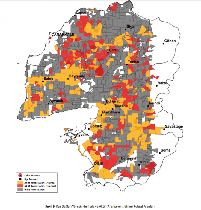 Henüz çok yakın bir tarihte, 14 Ekim 2022’de Bartın’da, bütün bir millet olarak yaşanan maden kazası faciasına şahit olduk. Özellikle kömür madenlerinin insan hayatına oluşturduğu doğrudan tehdidi bir kez daha büyük acılar yaşayarak hatırlamış olduk. Ancak maden tesislerinin insan hayatına ve bölgenin ekolojik sürdürülebilirliğine etkileri ihmal kaynaklı kazalarla sınırlı kalmıyor. Ülkemiz yeraltı kaynakları bakımından oldukça zengin bir coğrafyada bulunuyor ancak bu aynı zamanda bizim için bir tehdit oluşturuyor. Bu durum hem yerli hem yabancı özel şirketlerin topraklarımıza göz dikmesi anlamına geliyor. Çok yakın zamanda, 2019 yılında Çanakkale Kirazlı köyü civarlarında Kazdağları bölgesi, Kanadalı Alamos Gold firması tarafından hedef alınmıştı. Firmanın bölgede aktifleştirmek istediği maden tesisleri için gösterilen direnci hepimiz hatırlıyoruz. Neyse ki bölgenin duyarlı halkı ve aynı zamanda STK’ların büyük çabalarıyla süreç tamamen durdurulmuş ve maden ruhsatları o bölge için iptal edilmişti. Ancak bu direniş tabi ki yeterli değildi. Aşağıda Şekil 9’da görüldüğü üzere, Çanakkale’den İzmir Bergama’ya kadar olan bölgenin %79’unun maden ruhsatlı olduğu bilgisi göz önünde bulundurulduğunda ülkemizin kalıcı çözümler için ihtiyacı olan bu gibi direniş eylemlerindense kanunlarla korunan sağlam bir “Doğa Koruma Statüsü”dür.