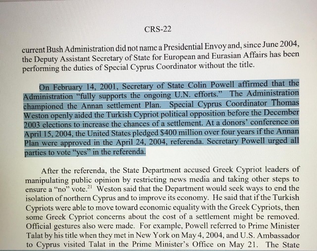 “...Kıbrıs Özel Koordinatörü (ABD) Thomas Weston, Aralık 2003 seçimleri öncesinde Kıbrıs Türk siyasi muhalefetine çözüm şansını artırmak amacıyla açıkça yardım etmiştir...”