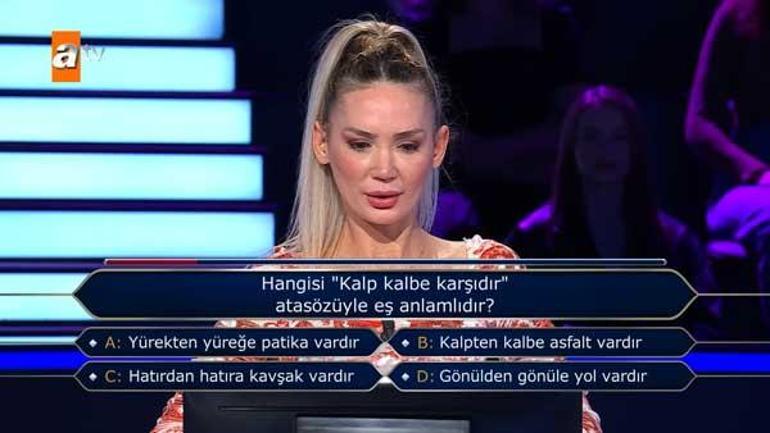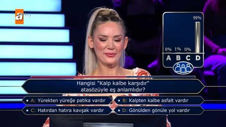 Yarışmaya Bursa'dan katılan müzisyen Serap Kaygısız, ilk soruya doğru yanıtı vererek ikinci soruya geçti. Kaygısız, ikinci soru olan ''Hangisi kalp kalbe karşıdır' atasözüyle eş anlamlıdır?'' sorusu karşısında kararsız kaldı.