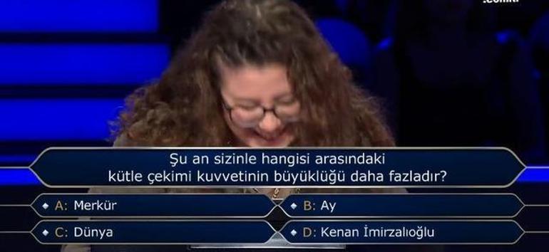 Yarışmanın şıkları arasında yakışıklı oyuncu Kenan İmirzalıoğlu'nun da adı vardı. Sorunun D şıkkı yarışmacıyı ve Kenan İmirzalıoğlu'nu güldürdü. Sunucu "Ben de adımı hiç burada beklemezdim" dedi. Yarışmacı joker hakkını kullanarak soruyu bildi. Doğru cevap ise 'C- Dünya' idi.