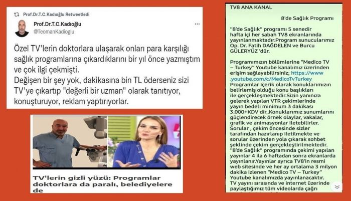 TV8’deki programcıların Prof.Dr. Kadıoğlu’na gönderdiği mesajda da görüldüğü gibi, istenen parayı ödeyen doktor programda kendisine sorulacak soruları yine kendisi önceden hazırlıyor; programcılara gönderiyor; yayın sırasında o sorular yöneltiliyor. Böylece insanları sağlık konusunda bilgilendirme görüntüsü altında doktor reklamı yapılıyor.