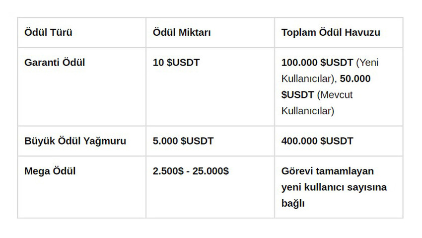Her davet ettiğiniz ve görevi tamamlayan arkadaşınız için 5 $USDT kazanabilirsiniz. Yeni kullanıcılar için garanti ödül havuzu 100.000 $USDT, mevcut kullanıcılar için ise 50.000 $USDT'dir. Ödül havuzu dolmadan görevleri tamamlayarak garanti ödüllerden faydalanabilirsiniz.