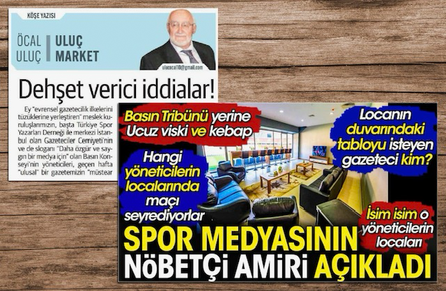 başlığı buydu. “Spor medyasının nöbetçi amiri” mahlasıyla kaleme alınan bu yazıda bazı futbol yazarlarının maçları basın tribünü yerine kulüp yöneticilerinin, işinsanlarının özel localarından izledikleri anlatılıyordu:“Localarda gazetecilerin içtiği viskilerin markasını bile biliyorum. Hangi gazeteci kaç duble içti, ne kadar fıstık yedi? Locaya gelen kebaplardan kaç porsiyon götürdü? Hepsini biliyorum. Çünkü rapor masamda duruyor.”
