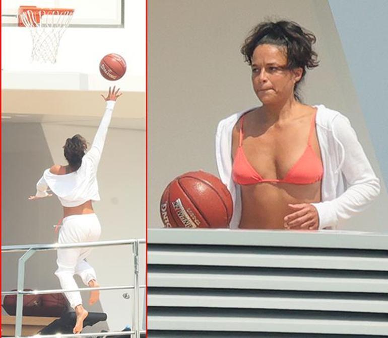 Rodriguez, turuncu bir bikini üstü ve beyaz bir eşofman altıyla lüks yatın basketbol sahasında bir erkek arkadaşı ile basketbol oynadı.