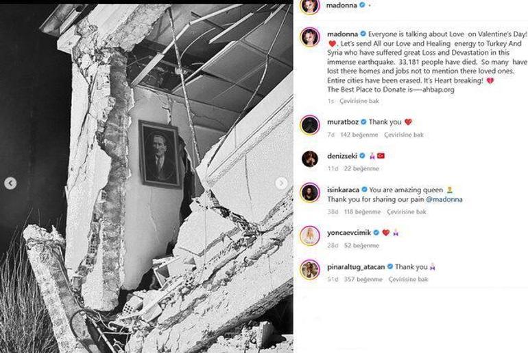 Madonna, "Sevgililer Günü'nde herkes aşktan bahsediyor. Bu büyük depremde büyük kayıp ve yıkım yaşayan Türkiye ve Suriye'ye tüm sevgi ve şifa enerjimizi gönderelim. Binlerce kişi öldü. Orada birçok kişi evini ve işini kaybetti. Sevdiklerini söylemiyorum bile. Tüm şehirler silindi. Kalp kırıcı" diyerek AHBAP Derneği'ne bağış çağrısı yaptı.