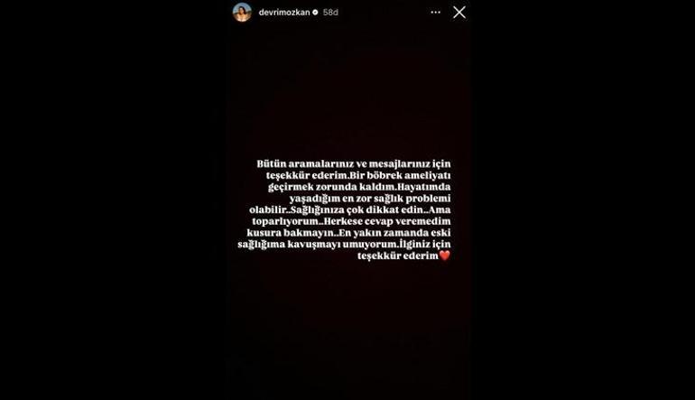 Ünlü oyuncu Devrim Özkan sosyal medya hesabından böbrek ameliyatı olduğunu açıkladı. Güzel oyuncu yaşadığı rahatsızlığı şu sözlerle ifade etti: Bütün aramalarınız ve mesajlarınız için teşekkür ederim. Bir böbrek ameliyatı geçirmek zorunda kaldım. Hayatımda yaşadığın en zor sağlık problemi olabilir. Sağlığınıza çok dikkat edin. Ama toparlıyorum. Herkese cevap veremedim kusura bakmayın. En yakın zamanda eski sağlığıma kavuşmayı umuyorum. İlginiz için teşekkür ederim.