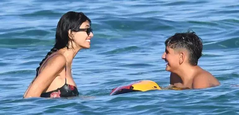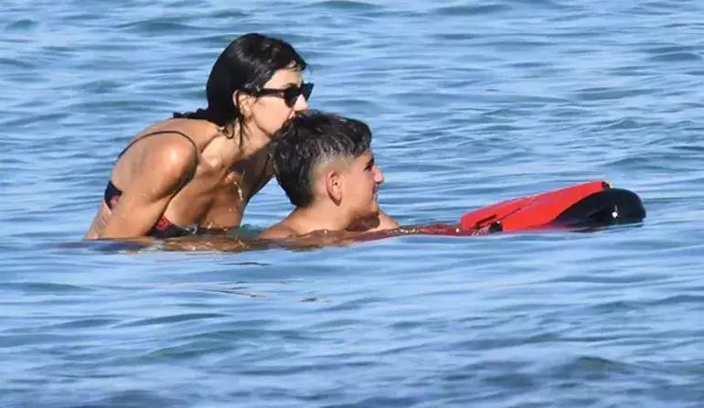 Ünlü isim, oğlu ile suda keyifli vakit geçirmiş; Ali Yiğit scooter ile dolaşırken, Akkuş da oğlunun ayaklarına tutunarak denizde tur atmıştı.