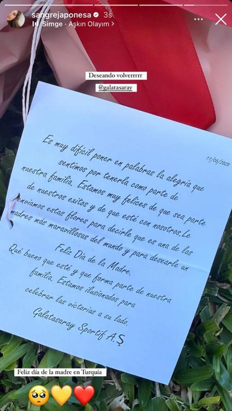 Galatasaray'ın gönderdiği tebrik kartında, "Bu kulüp için verdiğiniz emekleri biliyoruz. Sen harika bir annesin ve beş çocuğun seninle gurur duyacak. Her maçta bize getirdiğin şanstan dolayı seni özlüyoruz. Bugün ve her zaman tebrikler. Bu renkler için yaptıklarınızı kimse size unutturamayacaktır." yazıyordu.