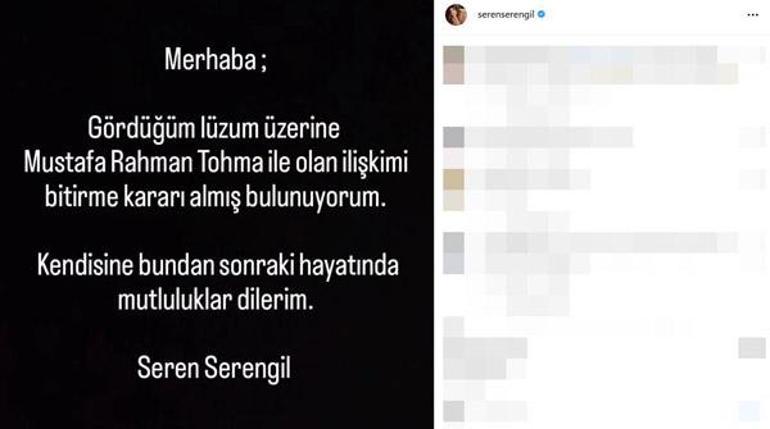 52 yaşındaki Serengil, sosyal medya hesabından peş peşe yaptığı paylaşımlarla Muhtafa Rahman Tohma ile ilişkilerinin bittiğini duyurdu.