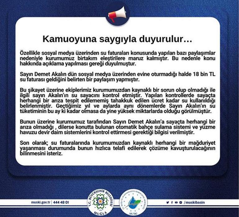 MUSKİ Genel Müdürlüğü’nün Bodrum’daki ekipleri, söz konusu villaya giderek, su kullanım miktarını inceledi. Bir hata olmadığını tespit eden ekipler, Demet Akalın’a cevap verdi.