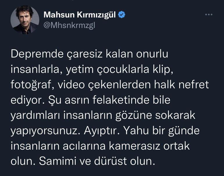 Mahsun Kırmızıgül, son olarak yardımlarını ‘göze sokarak’ yapanlara sosyal medya hesabından tepki gösterdi. İnsanların acılarına ‘kamerasız ortak olunması’ gerektiğini kaydeden Kırmızıgül, deprem bölgesindeki halkın bu tür davranışlardan nefret ettiğini de aktardı.
