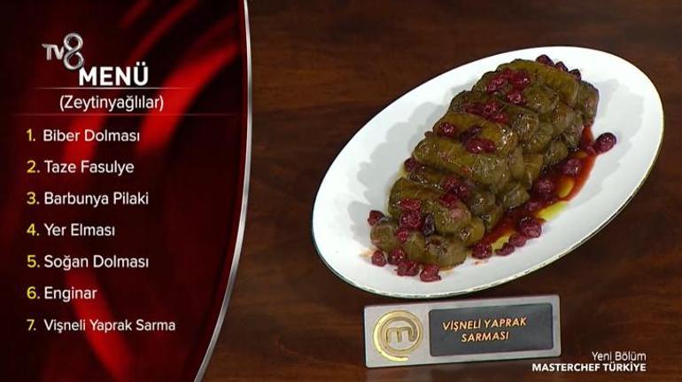Şefler yarışmacılara yapmaları için günün menüsünü açıkladı. Takımlardan Biber Dolması, Taze Fasulye, Barbunya pilaki, Yer Elması, Soğan Dolması, Enginar ve Vişneli Yaprak Sarma yapmaları istendi.