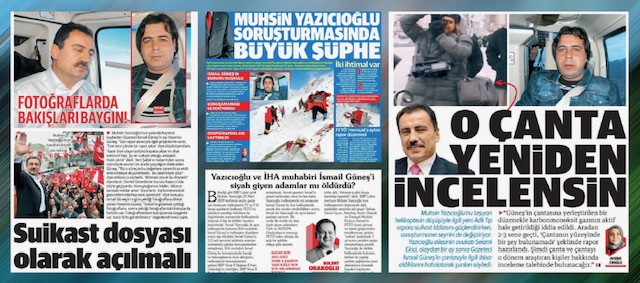 - Yeni Şafak, “Sır dolu çanta” manşetinde, Muhsin Yazıcıoğlu ile birlikte helikopter kazasında ölen gazeteci İsmail Güneş’in çantasına “karbonmonoksit düzeneği” kurulduğu ve “kazanın da bu düzenekle tetiklendiği” gibi akla ziyan bir iddiada bulundu.