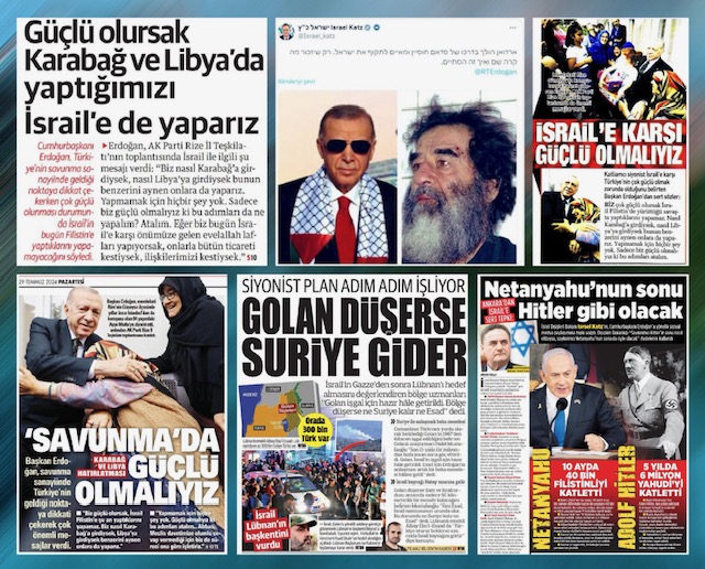 Sonra da İsrail’in Filistinliler’e uyguladığı şiddeti durdurmanın savaş dışında yolu yokmuş gibi savaş çığırtkanlığı başladı iktidar medyasında. Akşam yazarı Turgay Güler, “Türk ordusu vakti geldiğinde İsrail’e de girer” diye yazdı. Türkiye gazetesi, Yılmaz Bilgen imzalı “Golan düşerse Suriye düşer” manşetinde, bazı isimlerin “Türkiye’nin güneye inmesi zorunluluk halini aldı” tahriklerini yayımladı. Bunlar medyadaki savaş çığlıklarından küçük bir demet….