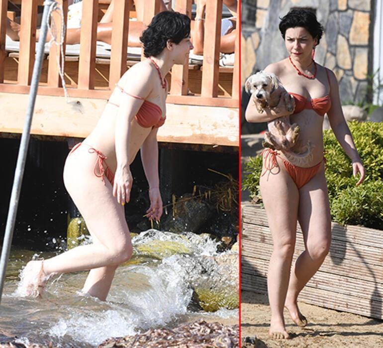 Pembe bikinisiyle dikkat çeken Boluğur, köpeğiyle birlikte denize girerek serinlemişti.