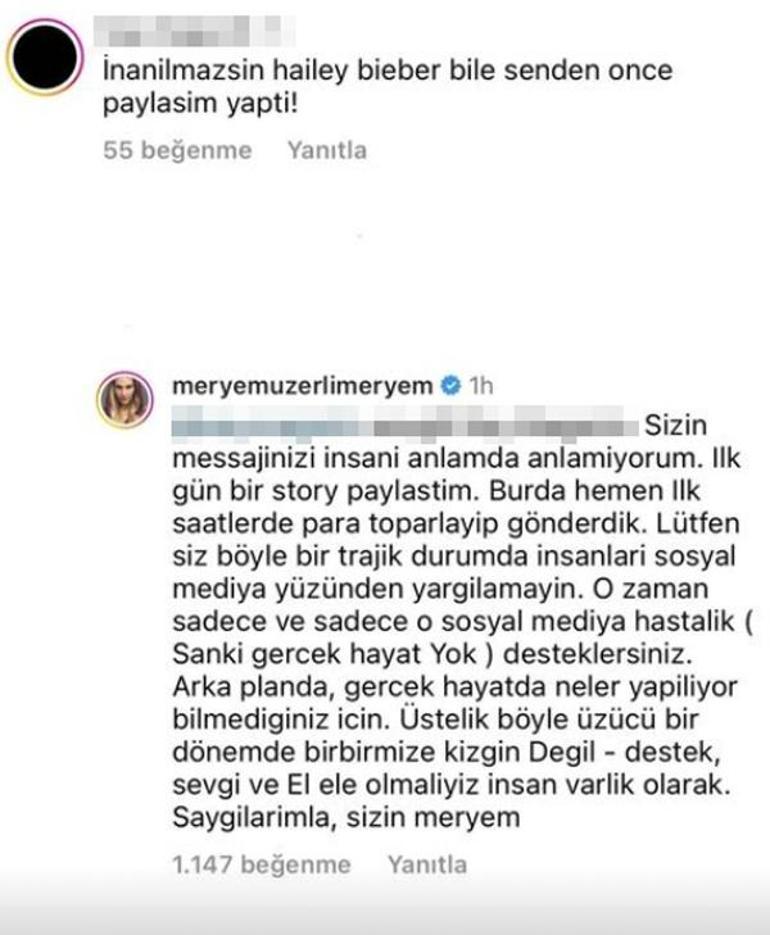 Bazı ünlü isimler ise 'az paylaşım yaptıkları' gerekçesiyle sosyal medyada eleştirilmekten kurtulamadı. Bu isimlerden biri de, yayınlandığı dönemde ilgiyle izlenen 'Muhteşem Yüzyıl' dizisinin Hürrem Sultan'ı Meryem Uzerli oldu.