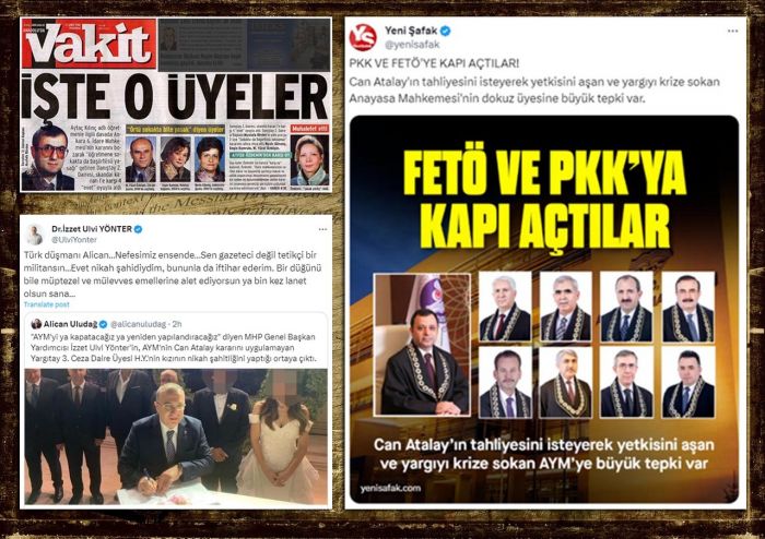 Yeni Şafak, şimdi de Hatay Milletvekili Can Atalay’ın serbest bırakılması kararı veren Anayasa Mahkemesi’nin dokuz üyesini hedef gösterdi. Hem de “FETÖ ve PKK’ya kapı açtılar” gibi absürt bir suçlamayla tümünün fotoğraflarını da yayımlayarak…