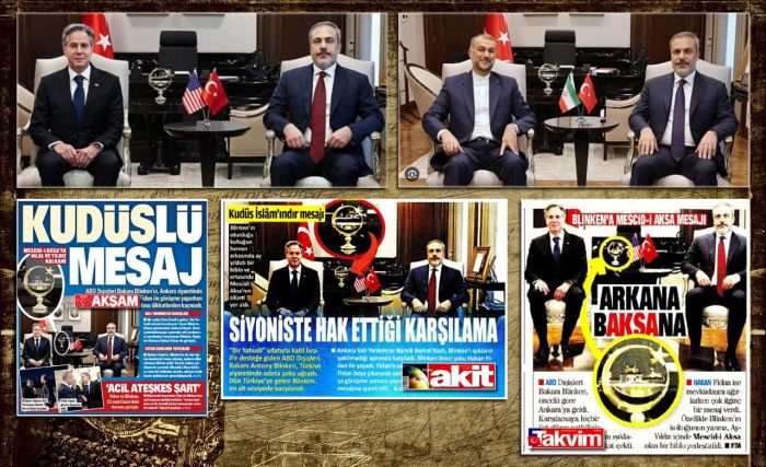 Fidan ile Blinken’ın arasına “Ay yıldız içinde Mescid-i Aksa figürü yer alan bir biblo konulduğunu” önce sosyal medyada Misvak Caps gibi hesaplar keşfetti! Bu keşfin üzerine Yeni Şafak, A Haber, Takvim gibi haber siteleri hemen atladı; Fidan’ın o biblo ile Blinken’a “Kudüs, Ay Yıldız'ın koruması altında olacak” mesajı verdiğini yazdılar. Basılı gazeteler Akşam “Kudüslü mesaj”, Yeni Akit “Siyoniste hak ettiği karşılama” ve Takvim ise “Blinken’a Mescid-i Aksa mesajı” başlıklarıyla ilk sayfaya taşıdı biblodan okunan mesajı.