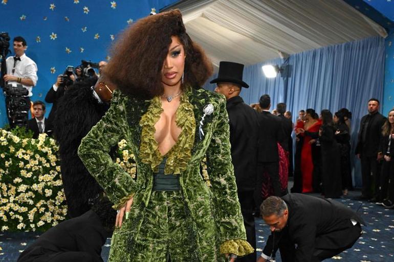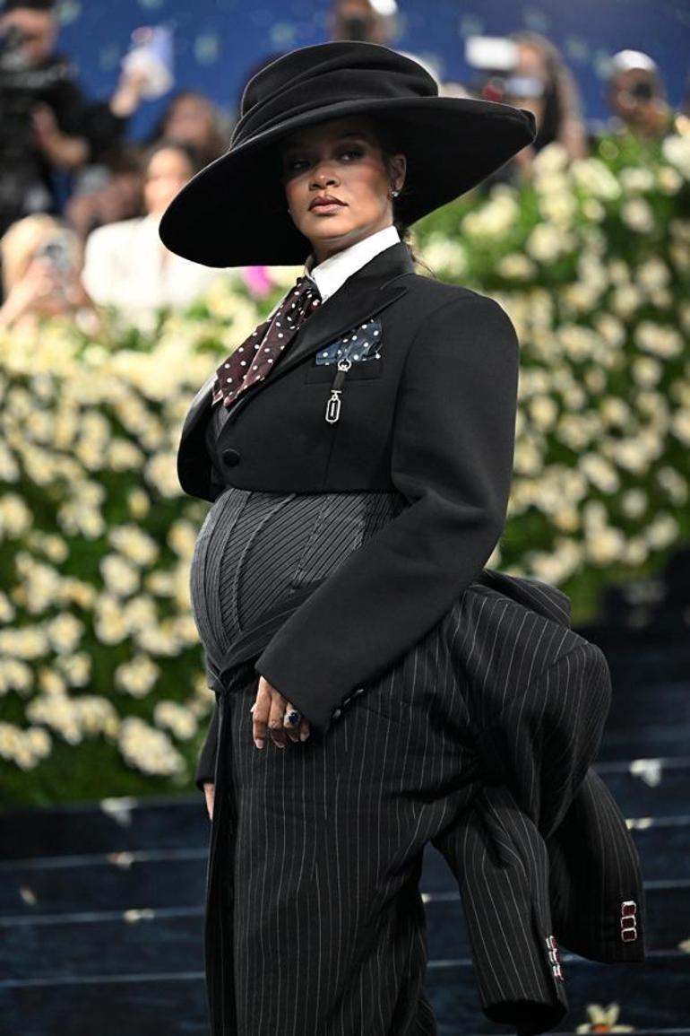 Partneri A\$AP Rocky ile üçüncü çocuğunu bekleyen Rihanna ise gri vücuda oturan bluz, kravat, kısa blazer ve çizgili etekle büyüyen karnını sergiledi. Üçüncü hamileliğini Met Gala'dan yalnızca birkaç saat önce duyuran şarkıcı, etkinlik öncesi Carlyle Hotel'de hamile karnını açıkça gösteren bir kombinle görüntülendi.