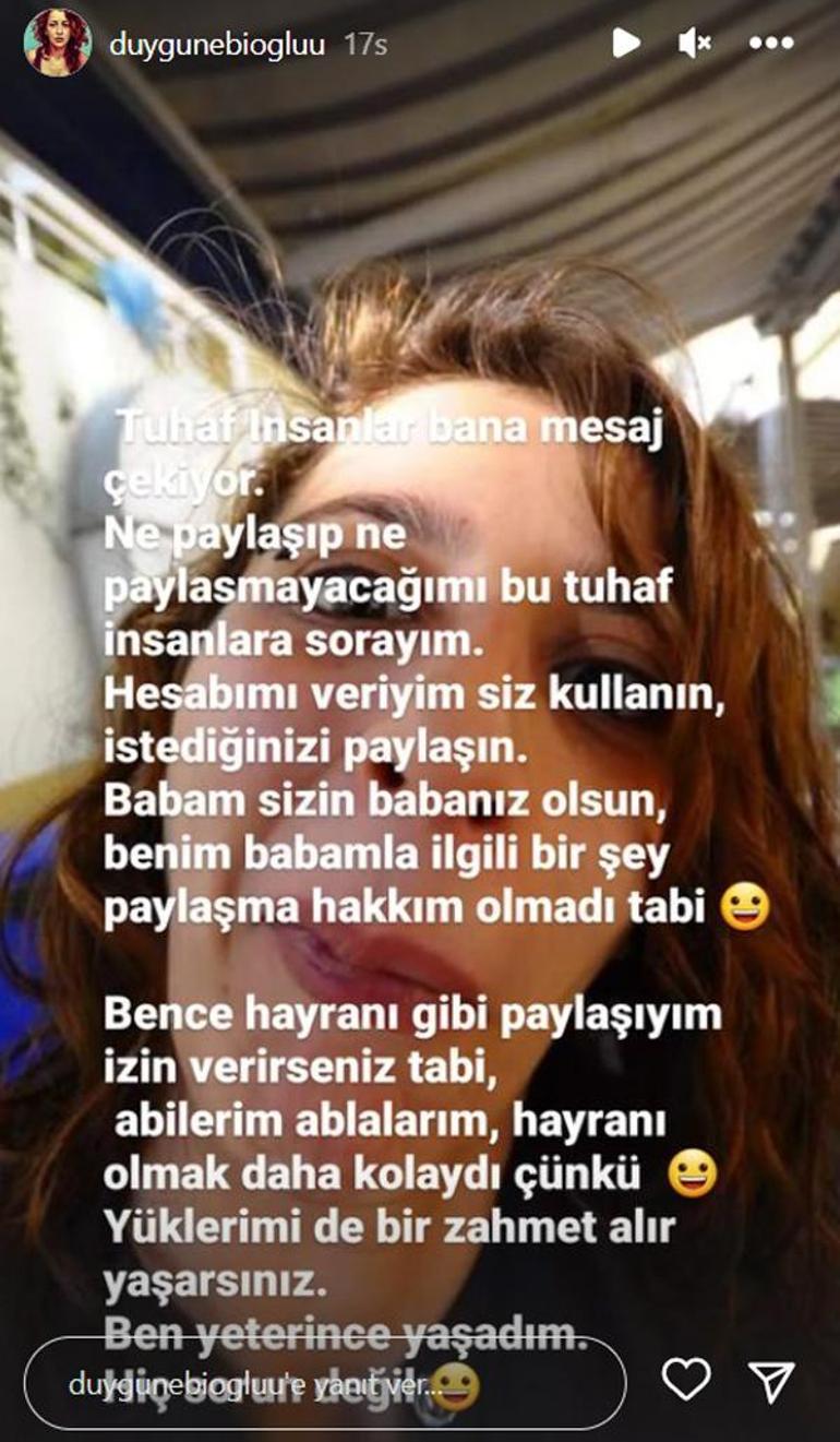 Nebioğlu, son olarak babasıyla ilgili paylaşımlarına gelen eleştirilere cevap verdiği bir yazısıyla gündeme geldi. Genç kadın, 13.5 bin takipçisi bulunan Instagram sayfasının hikayeler bölümünden yayınladığı mesajda şu ifadelere yer verdi: