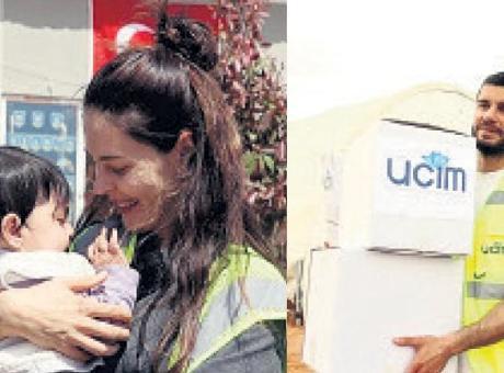 Çift, depremzedelerle sohbet ederek, gelen yardım kolilerini taşımaya yardımcı oldu. İkili, iftar saatinde ise vatandaşlara yemek dağıttı.