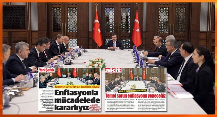 - Yeni Akit ve Yeni Şafak, Cumhurbaşkanı Yardımcısı Cevdet Yılmaz’ın başkanlığındaki Ekonomi Koordinasyon Kurulu toplantısının fotoğrafını Merkez Bankası’nın yeni kadın başkanı Hafize Gaye Erkan’ı çıkararak yayımladılar.