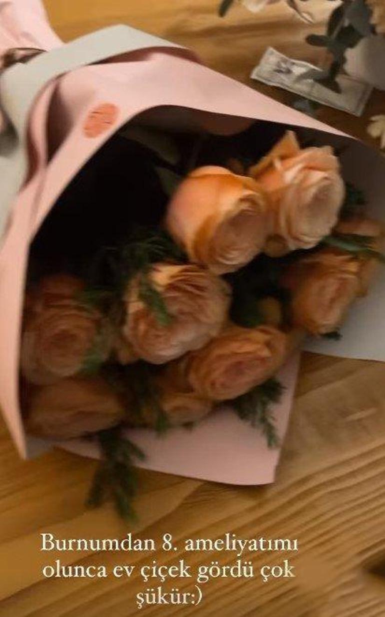 Sosyal medya hesabından kendisine gelen çiçeklerin bir fotoğrafını yayınlayan popçu; "Burnumdan sekizinci ameliyatımı olunca ev çiçek gördü çok şükür" diye yazdı.