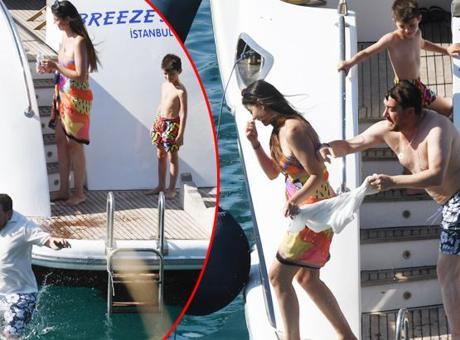 Murat Kurşun'u iterek suya düşüren Asena Kurşun'a, eşinden karşılık geldi. Şarkıcı, tekneye çıkar çıkmaz eşini suya itip kahkaha attı.